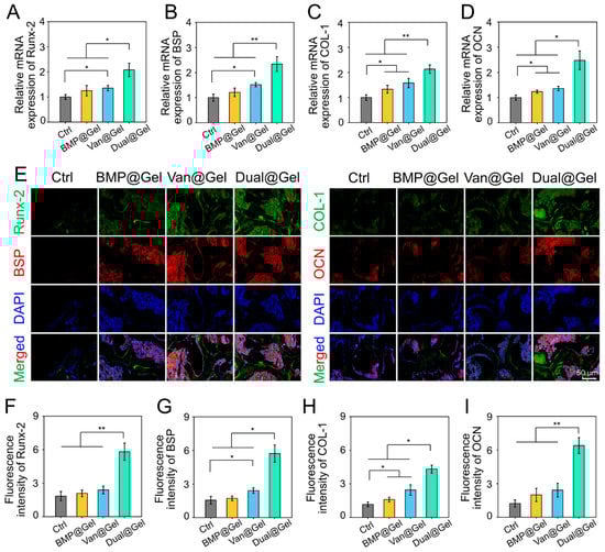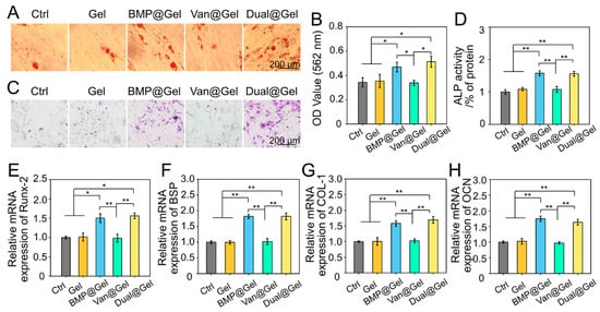 To test the function of the drug-loaded hydrogel on osteogenic differentiation at the transcription level, critical osteogenic genes, including Runx-2, BSP, COL-1, and OCN, were evaluated by RT-qPCR. Activation of Runx-2 expression is critical in the initial stage of osteogenic differentiation, and Runx-2 can upregulate the levels of OCN and osteopontin (OPN) []. As another iconic marker of osteogenic differentiation of BMSCs, COL-1 is an indicator of osteoblast mineralization, indicating bone formation capacity []. In addition, OCN, which is synthesized by osteoblasts and suggests osteogenic maturation, is an important late osteogenic indicator [,]. As shown in Figure 3E,F, Runx-2, BSP, COL-1, and OCN expression in the BMP@Gel and Dual@Gel groups were significantly upregulated compared to the control, Gel, and Van@Gel groups.