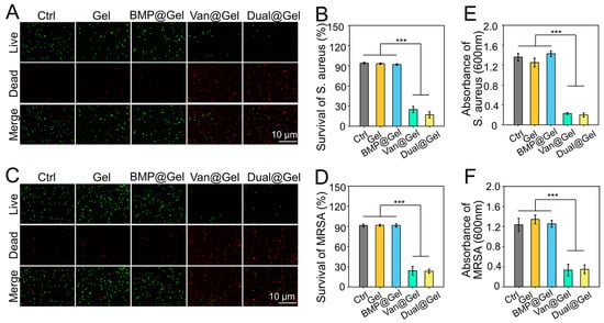 (A) BacLight dead/live staining of S. aureus treated with different samples for 24 h. (B) Quantitative analysis of survival rates of S. aureus. (C) BacLight dead/live staining of MRSA treated with different samples for 24 h. (D) Quantitative analysis of survival rates of MRSA. (E) Proliferation of S. aureus by optical density measurement. (F) Proliferation of MRSA by optical density measurement (*** p < 0.001).