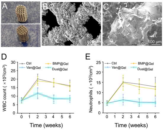 The visual photos of prepared titanium alloy implant and hydrogel modified implant were displayed in Figure 5A. The SEM images of the microporous titanium alloy implant revealed that the pore size of the scaffold was ~800 μm (Figure 5B). In addition, after modification, the hydrogel fills all the empty space in porous structure of the implant (Figure 5C). The management of peri-implant infections remains a formidable clinical challenge. A series of therapeutic strategies have been applied, including antibiotic spacers, surgical debridement, and vascularized bone grafts. [,]. However, due to the lack of biodegradability and osteoinductivity, conventional bone cement-loaded antimicrobial agents have not been prioritized in managing infected bone defects []. Therefore, bone substitutes with excellent bone conductivity and significant antibiotic activity can be used as implants for contaminated bone defects []. However, owing to the multiple drug resistance of bacteria and insufficient osteoinduction, there are still no effective bone substitutes in the market []. A hydrogel with dual antibacterial and osteogenic induction properties was designed to address these challenges in managing infected bone defects. As shown in Figure 5D, the severity of systemic infection was assessed using the peripheral blood WBC count and neutrophil detection. These values were within the physiological range at 0 weeks, that is, before bacterial implantation. However, after implantation, the WBC counts in the control and BMP@Gel groups increased continuously and were higher than those in the Van@Gel and Dual@Gel groups. This phenomenon indicated that the local release of vancomycin inhibited bacterial proliferation and spread. Another indicator of infection status, neutrophil count, showed similar results (Figure 5E).