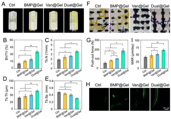 (A) Representative 3D reconstruction photographs of bone regeneration around the implant. (B–E) Analysis of bone morphological parameters, including BV/TV, Tb.N, Tb.Th, and Tb.Sp around the implant based on Micro-CT scanning. (F) Representative Masson staining images in the region of bone defects. (G) Evaluation of bone integration by pull-out biomechanical testing. (H) Representative images of calcein fluorescence double-labeling. (I) MAR analysis based on calcein double-labeling (* p < 0.05 and ** p < 0.01).