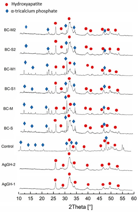 The chemical and phase composition of biomaterials, especially in the case of hybrids, is crucial for evaluating and optimizing their properties for specific applications. The XRF measurement confirmed that produced granules contain 0.11 wt.% (AgGH-1) and 0.93 wt.% (AgGH-2) of silver. The results of XRD measurements show that the granules are composed of hydroxyapatite as the only crystalline phase, whereas the set materials are composed of hydroxyapatite and α-tricalcium phosphate (Figure 1). No additional, undesirable crystalline phases were detected via XRD (Table 2).