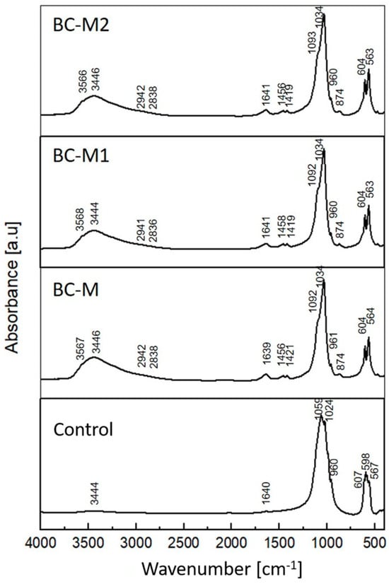 The Fourier-transform infrared (FTIR) spectroscopy spectra of all set and hardened materials were similar (Figure 2). The strongest bands assigned to calcium phosphates were centered at 1034 cm–1 and around 1092 cm−1 and were assigned to anti-symmetric stretching modes of P-O. The typical bands corresponding to the carbonate groups are located around 874, 1419 and 1458 cm−1, indicating the presence of B-type carbonated hydroxyapatite in the materials. The carbonate ions were probably introduced to the hydroxyapatite structure during the synthesis. Bands at around 563 and 604 cm–1 were assigned to triply degenerate the P–O–P bending mode. The wide band at around 3446 cm−1 is connected to the vibratory stretching of the OH group of hydroxyapatites and the band at 1641 cm−1 is attributed to adsorbed water molecules and overlaps with the band assigned to C-O carbonyl stretching from the glucose in the methylcellulose. Methylcellulose possessed characteristic absorption bands at 1460, 1380, 1320 and 950 cm−1 attributed to the C−H stretching of CH2 and CH3 groups, as well as the 1110 cm−1 band assigned to C−O−C stretching within an anhydroglucose ring []. Also, bands connected to O-H stretching vibrations at around 3459 cm−1, C-H stretching at 2932 and 2843 cm−1 and C-O carbonyl stretching have been previously reported [,]. Some of these bands, such as those at 2942 cm−1 and 2838 cm−1, overlapped with bands assigned to calcium phosphates and were hardly visible due to the low concentration of the polymer in the materials.