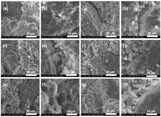SEM microphotographs of biomaterials cross-sections: BC-S (a,b), BC-M (c,d), BC-S1 (e,f), BC-M1 (g,h), BC-S2 (i,j), BC-M2 (k,l) (mag. 1000× and 5000×, respectively).