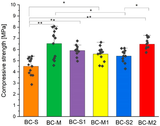 Compressive strength of biomicroconcretes 7 days after setting and hardening (n = 10) (* p < 0.05, ** p < 0.01).