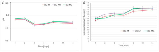 Figure 6b, demonstrated a minor increase in ionic conductivity connected with the samples’ dissolution and ion release, up to 139 ± 4 µS/cm (BC-M), 144 ± 9 µS/cm (BC-M1), and 147 ± 6 µS/cm (BC-M2). In vitro studies on αTCP-based cements with a similar ion release profile conducted by Przekora et al. [] did not display cytotoxicity.