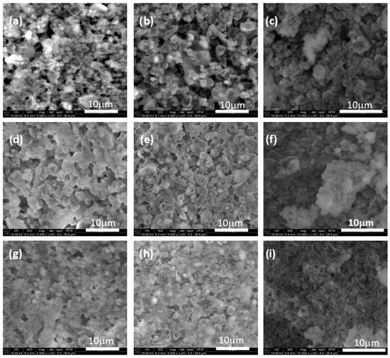 SEM microphotographs of biomicroconcrete surfaces before and after incubation in SBF; (a) BC-M before incubation, (b) BC-M after 7-day incubation, (c) BC-M after 14-day incubation in SBF; (d) BC-M1 before incubation, (e) BC-M1 after 7-day incubation, (f) BC-M1 after 14-day incubation in SBF; (g) BC-M2 before incubation, (h) BC-M2 after 7-day incubation, (i) BC-M2 after 14-day incubation in SBF.
