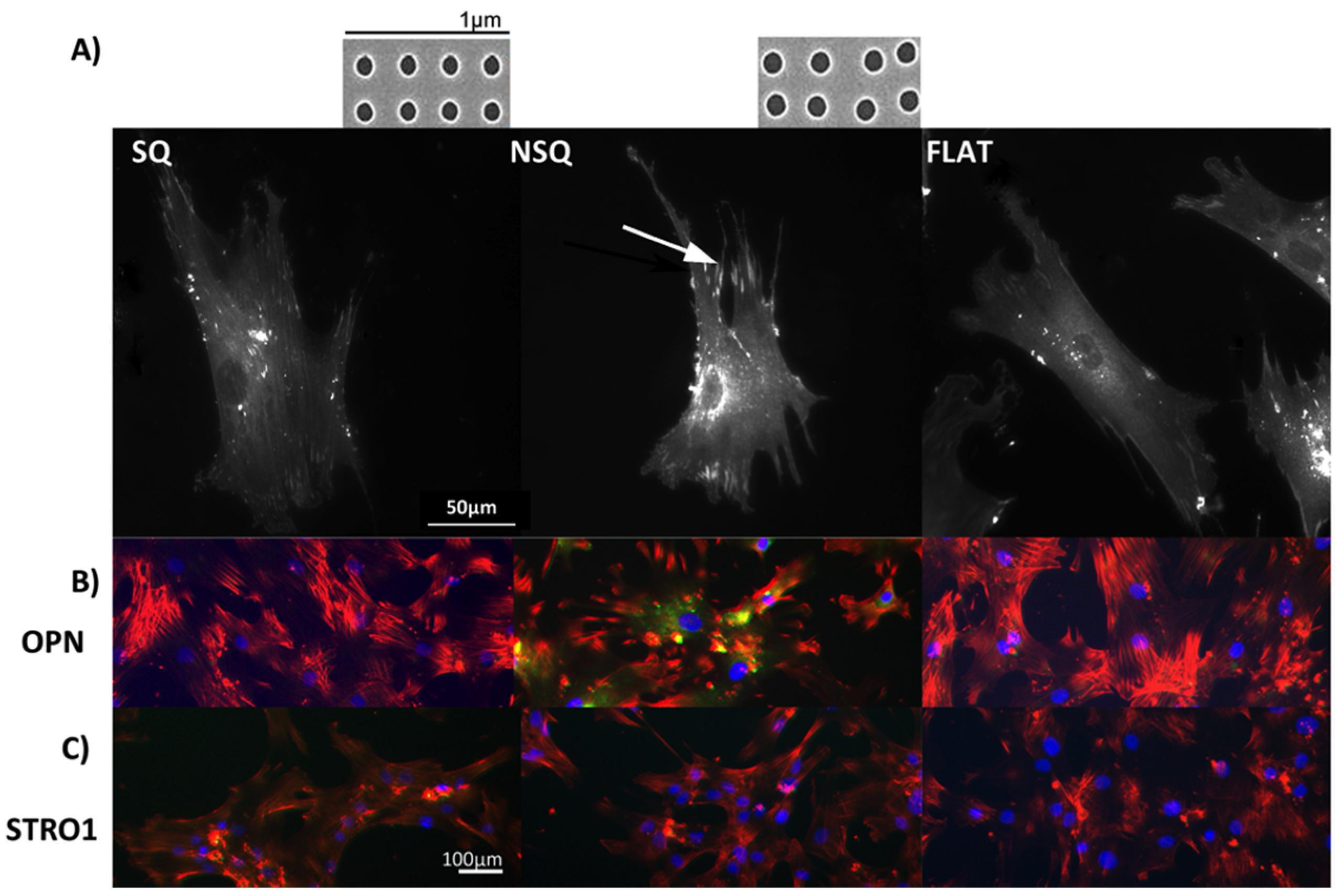 Fluorescent microscopy images of mesenchymal stem cells (MSCs). (A) MSC morphology and attachment on nanopit substrates. (i) On highly ordered nanotopography (shown in inset above SQ, SEM of square (SQ) 120 nm diameter pits, 100 nm deep, average 300 nm centre-centre spacing in a square arrangement), cells appeared less-spread and stellate in shape displaying small adhesions; (ii) On a disordered nanotopography (shown in inset above NSQ, SEM near square (NSQ), as before but with up to ±50 nm placement error), MSCs were spread with large lamellae and adopted an elongated cell shape. Super-mature adhesions (arrow) were observed in these cells; (iii) The MSCs morphology/adhesion pattern on the flat control surface appeared to be of an intermediate state of the two test topographies; (B) Fluorescent microscopy of MSC differentiation on nanotopographies. The MSCs cultured on NSQ showed strong expression of the bone marker osteopontin (OPN). Red = actin, green = OPN, blue = nucleus; (C) Fluorescent microscopy images of cell surface markers for MSC self-renewal. Only MSCs cultured for 4 weeks on the SQ surface express the MSC marker STRO-1. Red = actin, green = STRO-1 blue = nucleus. MSCs on planar controls did not express either of these genes after the 4 weeks culture.