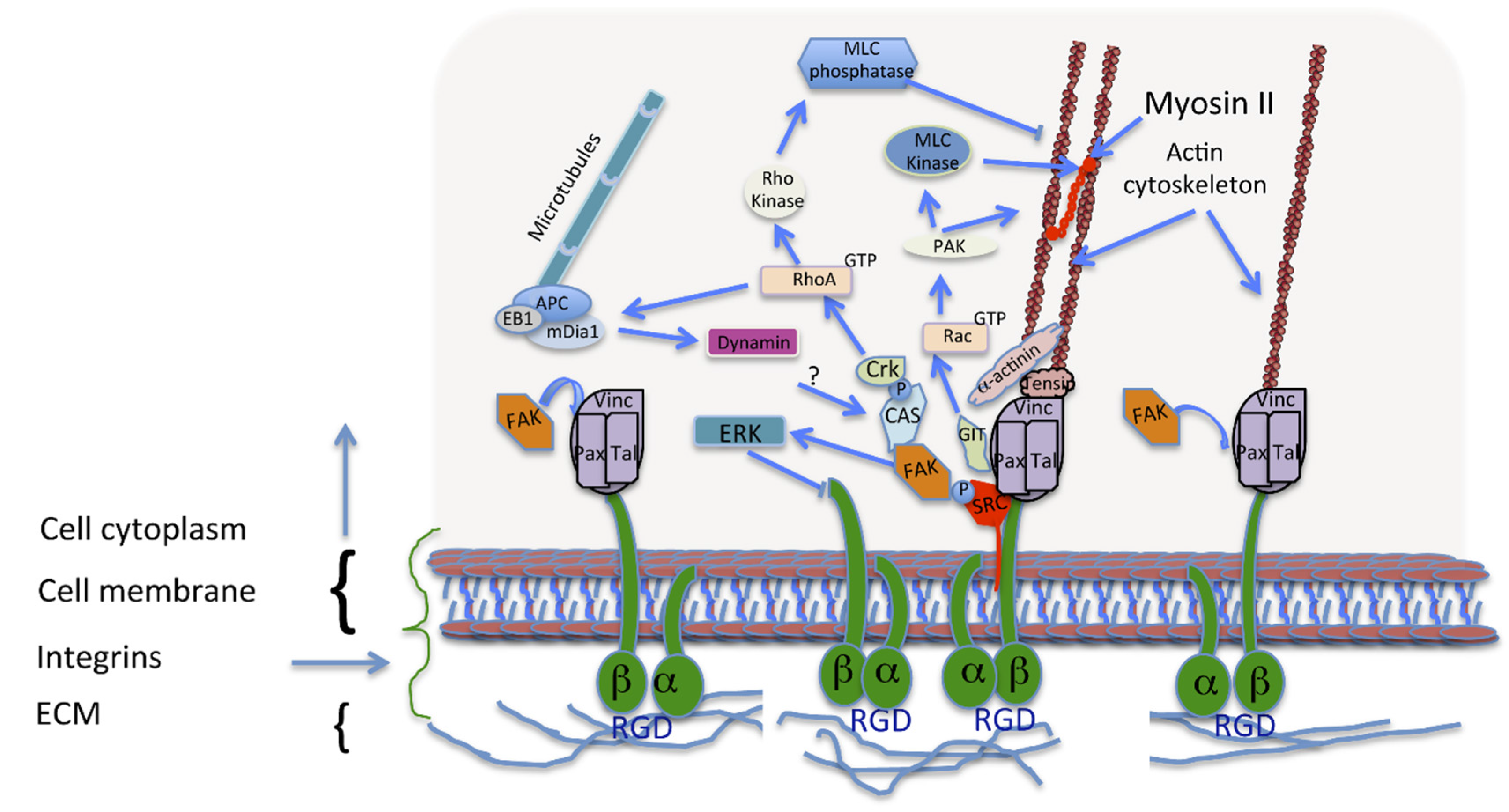 Focal adhesion (FA) formation and maturation. Immature adhesions, formed after integrin binding (right), are connected to the actin cytoskeleton via a protein complex involving linking proteins such as α-actinin, vinculin and talin. Signalling adaptors, FAK and paxillin, are recruited to these focal complexes (middle). FA formation, activates Rac, thus promoting actin polymerization and inhibiting myosin II coupling in the lamellipodium. These processes are required for the assembly and disassembly of different adhesions upon cell movement. During adhesion maturation the focal complexes develop into larger and longer FAs with the recruitment of more proteins like tensin (middle). Talin, vinculin, and p130Cas, have tension-sensitive conformations. RhoA activation is required for FA formation and actin bundling due to increased myosin II activity. Upon FA disassembly, dynamin is involved in the internalization of the integrins, and microtubule targeting.