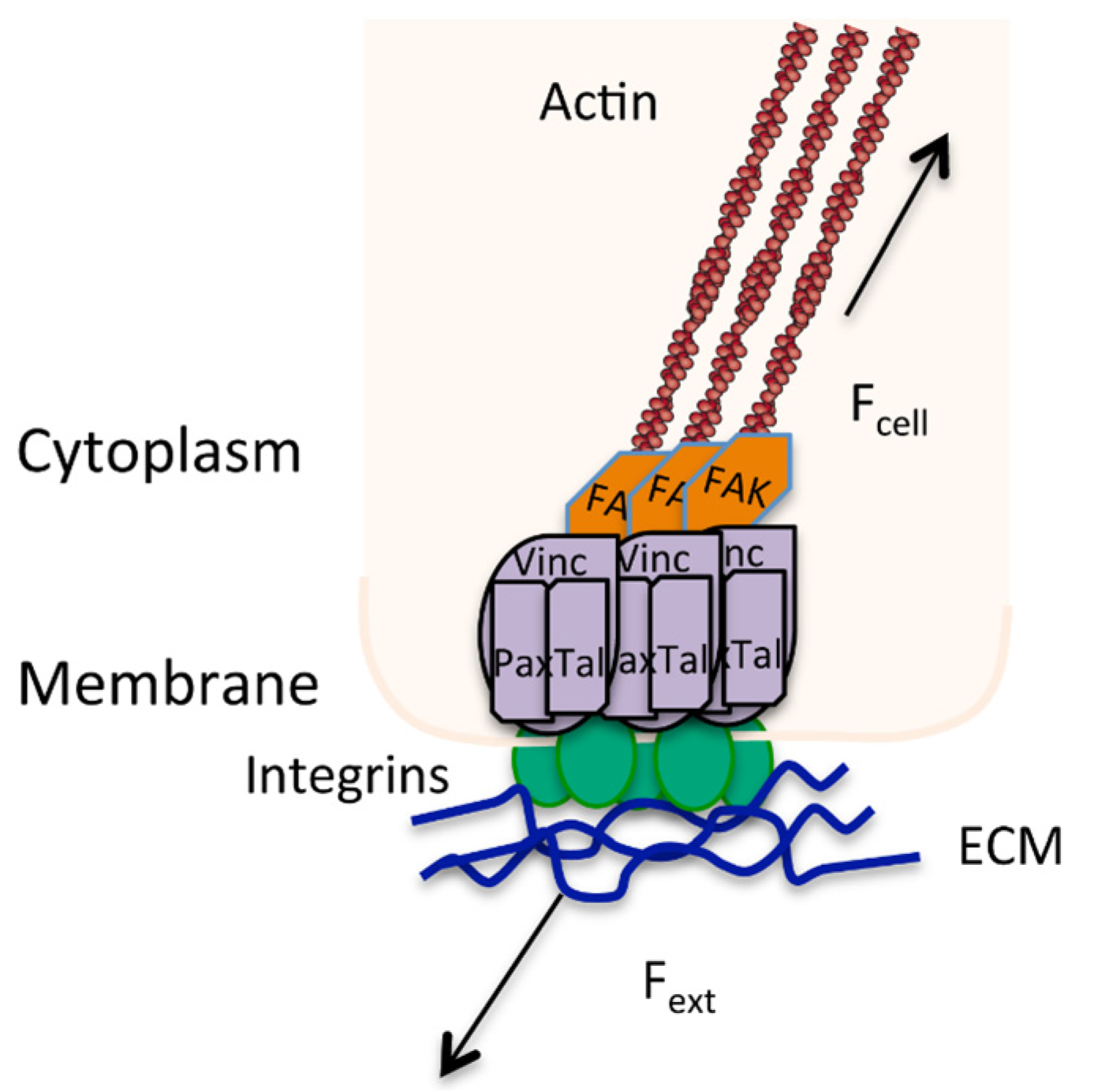 Focal adhesion showing the bi-directional signaling caused by a balance of external (Fext) and internal forces (Fcell) in directing stress at a mechanosensor point. Actin stress fibres (brown) are anchored into focal adhesion complexes (i.e., vinculin, talin, paxilin, FAK) that are bound to the ECM through integrins (green).