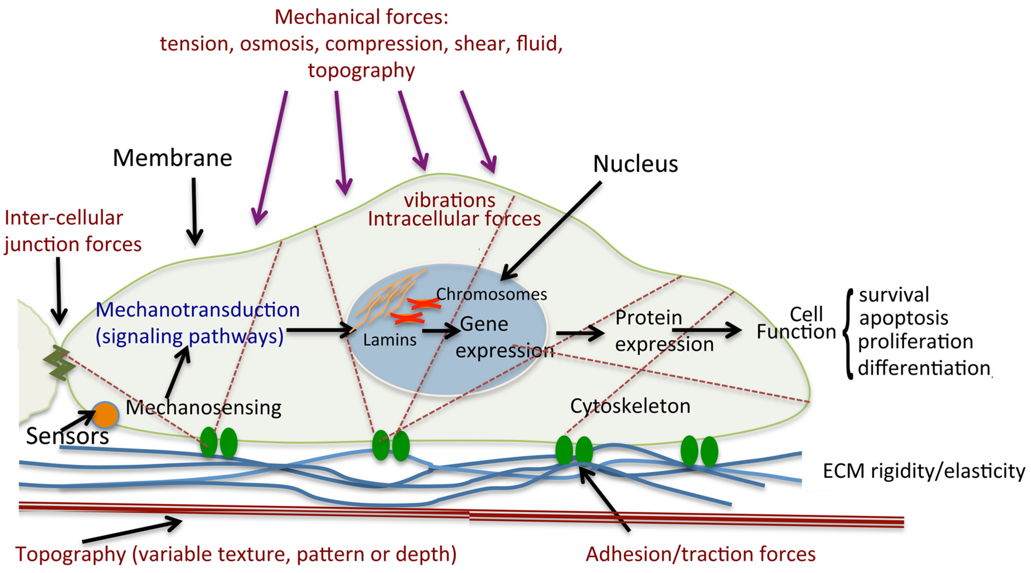 Schematic diagram of cell mechanical stimulation. Mechanical forces stimulate cells through the activation of mechanosensors, including the receptors that respond to ligands. Cells are exposed to different types of forces: extracellular such as shear forces through fluid flow over the cell surface, tensile/traction forces through the ECM, intercellular through contact with neighbouring cells, and intracellular cytoskeletally generated contractile forces (actomyosin contraction, microtubule polymerisation and depolymerisation, osmotic forces). Sensor activation leads to initiation of signaling cascades, and hence changes in gene expression. Such mechanotransduction results in modulations of protein expression and cellular functions such as survival, proliferation and differentiation. Illustrated is a single cell attached to a complex ECM through the focal adhesions.