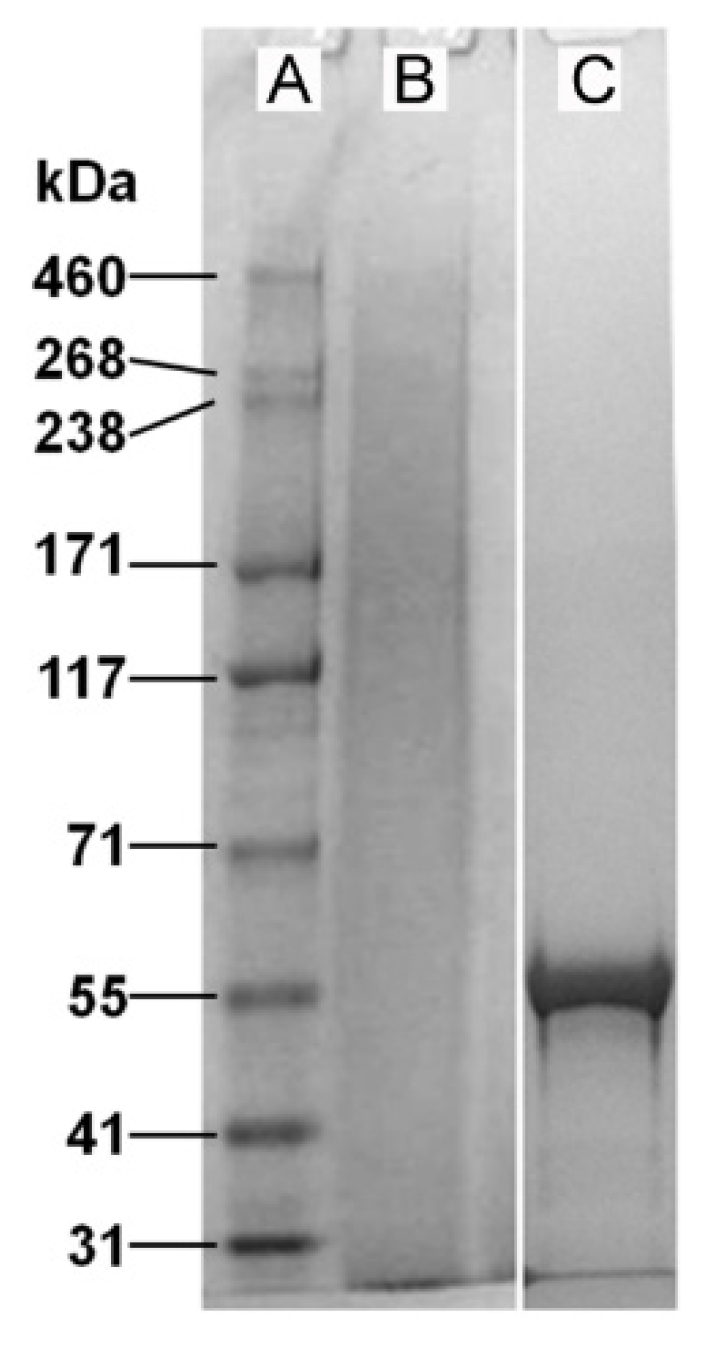 Relative molecular weight distribution for purified native Bombyx mori silk fibroin (B) and recombinant human tropoelastin (C), as displayed by gel electrophoresis. While the extracted fibroin proteins present as a broad range of peptide fragments, recombinant human tropoelastin has a defined molecular weight of approximately 55 kDa. The left lane (A) shows a selection of molecular weight markers.