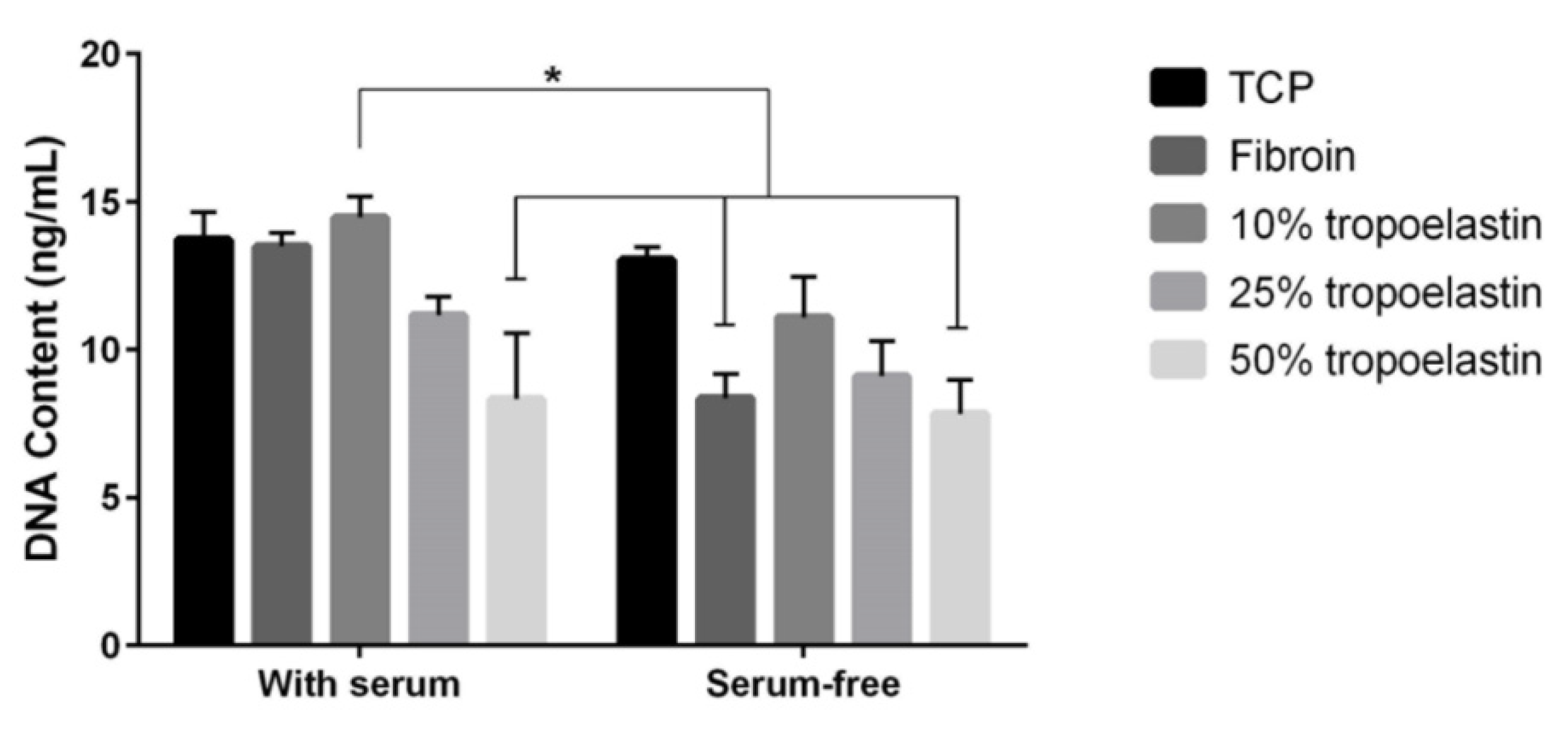 Since fibroin supports the attachment and growth of RPE cells [8] and tropoelastin has also been shown to positively influence cell attachment [21,22], we examined different blend ratios of fibroin and tropoelastin with the goal of identifying an optimal formulation for the resulting blend membrane. As demonstrated in Figure 2, a consistent trend was observed towards an optimal RPE cell attachment (as defined by DNA content), in either the presence or absence of serum (10% v/v), using a tropoelastin-fibroin ratio of 10 to 90 parts by weight. This result was consistent with prior reports [21,22] and has been explained as the optimal ratio between the two proteins.