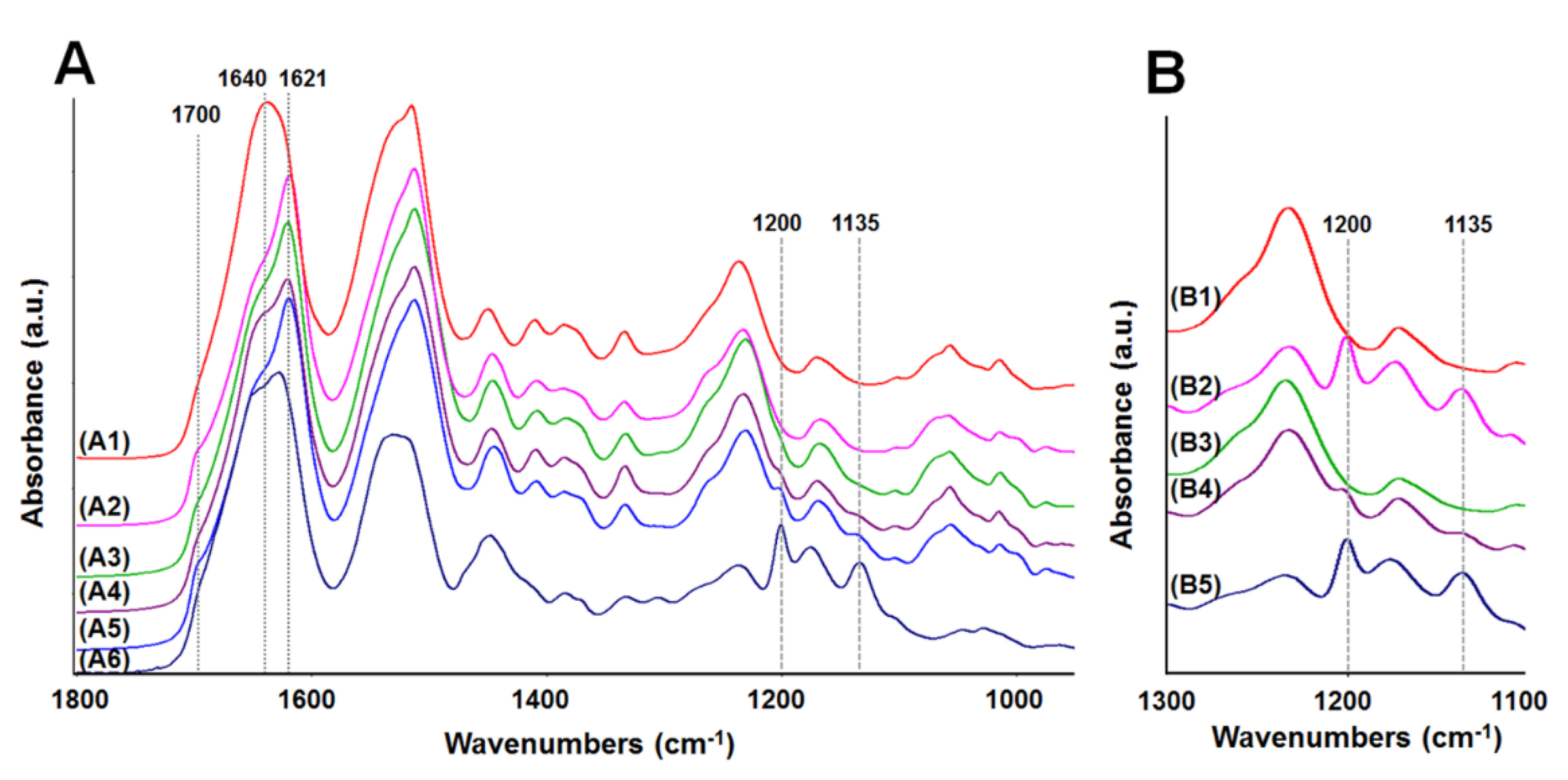 FTIR-ATR spectra of membranes. (A) (in the range of 1800–950 cm−1): (A1) fibroin membrane (water annealed at 25 °C, 6 h), (A2) fibroin membrane (water annealed at 60 °C, 12 h), (A3) blend membrane (fibroin:tropoelastin = 90:10), (A4) three-layered membrane—side 1, (A5) three-layered membrane—side 2, (A6) tropoelastin membrane (untreated); and (B) (in the range of 1300–1100 cm−1): (B1) two-layered membrane (untreated)—fibroin side, (B2) two-layered membrane (untreated)—tropoelastin side, (B3) two-layered membrane (methanol treated)—fibroin side, (B4) two-layered membrane (methanol treated)—tropoelastin side, (B5) tropoelastin membrane (untreated).