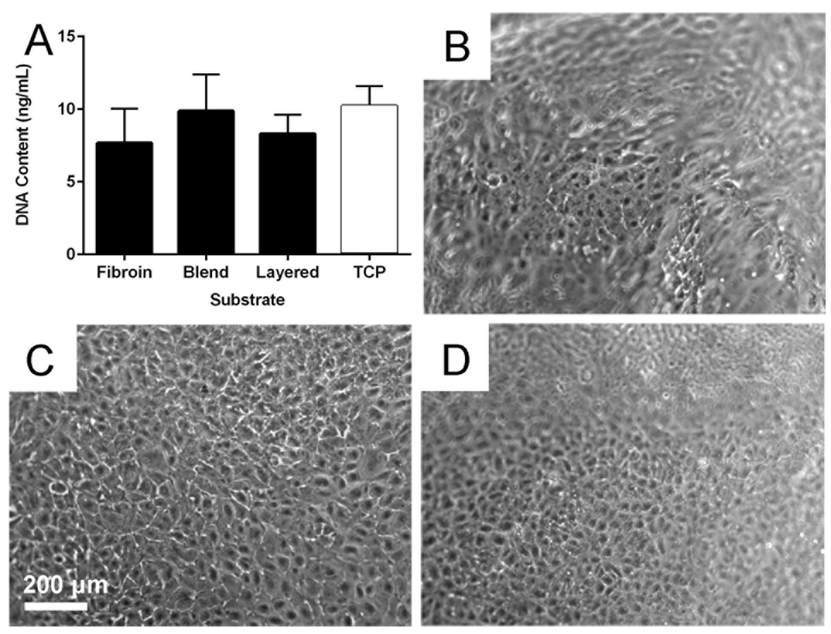 Retinal pigment epithelial (RPE) cell behaviour on biomaterial membranes. Quantification of RPE cell numbers (A) using the PicoGreen® assay after 3 days culture on fibroin, blend, and layered membranes; Tissue culture plastic (TCP) was included as control substrate. Phase contrast micrographs of RPE cells after 21 days of growth on fibroin (B); blend (C); and layered (D) membranes. The undulating nature of the suspended membranes is the reason some areas of panels (B) and (D) are out of focus. The scale bar represents 200 µm and applied to the micrographs.