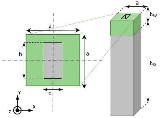 Scheme of the square cuboid unit cell (lattice constant a) composed of Si substrate (grey; thickness hSi) and tungsten film (green; thickness hW). Position and dimensions (length c and width d) of the parallepipedic hole dug in the tungsten film are indicated.