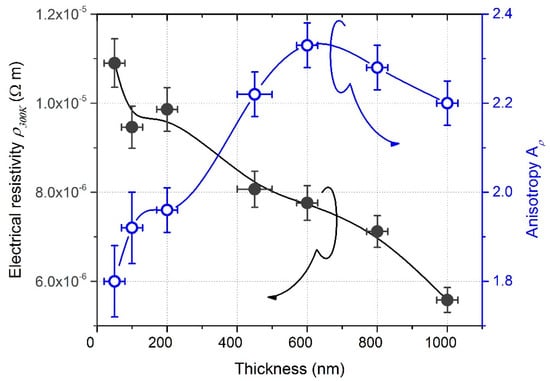 DC electrical resistivity and anisotropic resistivity measured at room temperature (300 K) as a function of the film’s thickness.