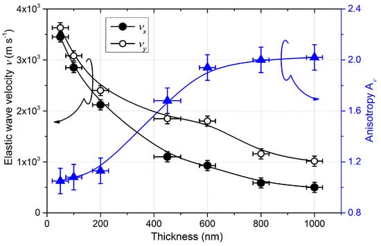 The group velocities of the Rayleigh waves following the x- (parallel to the incoming flux) and y-direction (perpendicular to the incoming particle flux) were obtained from the local slope of the dispersion curves for a wave vector k/2π = 1/λ = 3 × 105 m−1 in our case (where λ is the wavelength). The calculated group velocities of the Rayleigh waves of W thin films change as a function of the film’s thickness, as shown in Figure 5.