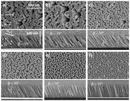 Cross-section observations of slanted columnar W structures also showed a continuous evolution as a function of the film’s thickness. Some columns fell under the shadow of bigger ones and become extinct (especially noticeable from the cross-section views of the thickest films in Figure 2e,f). This shadowing-induced competition between columns continuously occurred during the film growth. It was previously shown that the GLAD films morphology is scale-invariant with a power-law scaling connecting thickness and columns’ width in x- and y-directions []. Surface self-diffusion, atomic mobility, ballistic character of incoming particles, or dragging phenomenon are quite a few mechanisms which significantly influence the column broadening and tilting vs. film thickness, and thus, the final structural morphology and anisotropy []. Despite several growth simulations in agreement with experimental data and predicting column angle and broadening, the structural anisotropy of GLAD films still remains strongly dependent on operating conditions and experimental methods (cf. Section 3.2 on the role of the argon sputtering pressure).