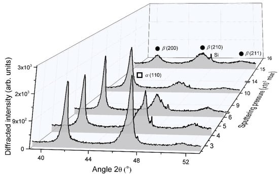 A substantial increase in resistivity was measured for an argon sputtering pressure higher than 6.0 × 10−3 mbar. This pressure range has to be correlated with the gradual evolution of the films’ microstructure (Figure 6), vanishing of the α phase and smooth decrease in the crystal size of the β phase down to a few nanometers for the highest pressure (Figure 7). Despite the shorter spaces between tilted columns as the pressure rose, voids still remained and contributed to the electron scattering. In addition, XRD patterns showed a broadening of diffracted signals related to the β phase, which means a crystal size lower than the electron mean free path. As a result, the film’s resistivity was dominated by characteristics of the remaining β phase, the latter being more resistive than the α phase.