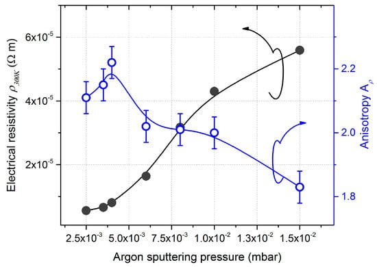 Argon sputtering pressure did not only impact on the morphology and crystal structure of W GLAD thin films but it also influenced their electrical and anisotropic resistivity, as shown in Figure 8. A continuous and gradual increase in resistivity from ρ300K = 5.7 × 10−6 to 5.6 × 10−5 Ω m was measured when the pressure changed from 2.5 × 10−3 to 15 × 10−3 mbar, respectively.
