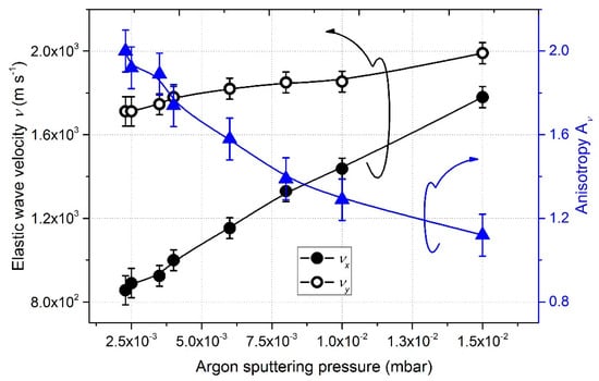 For the lowest pressures (2.5 × 10−3 to 4.0 × 10−3 mbar), the sputtered vapor was strongly directional, which favors shadowing conditions. The lateral growth allowed neighboring columns to touch and chain together, whereas shadowing prevented columns merging along the x-direction. This produced a preferential bundling of the columnar microstructure in the y-direction []. Hence, the velocity was significantly lower following the x-direction, which led to an important elastic anisotropic coefficient (Av = 1.8 to 2). Both velocities in the x- and y-directions increased with argon sputtering pressure. This evolution was correlated with the microstructural changes in the films and the reduction of porosity (Table 2).