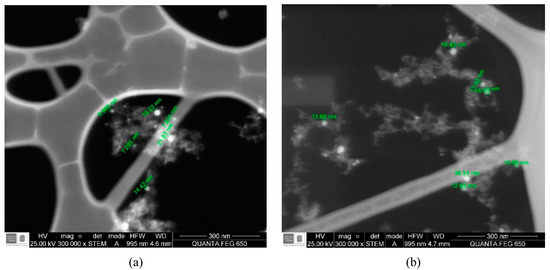 In addition, a high size distribution is due to possible agglomerations of nanoparticles in the water. As their concentration increases, especially in the results obtained by DLS—since the size is measured hydrodynamically—then, it can be concluded that the sizes obtained by this technique are an initial approximation [30]. This can be observed when making a comparison between the values obtained by the two techniques, since they showed very different results, although they indicate that particles in the nanometric range were obtained.