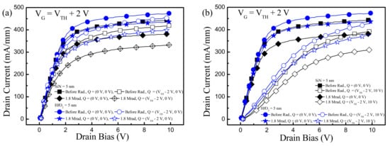 Pulse-mode stress measurement results. Drain current as a function of drain bias with the quiescent bias of: (a) (0 V, 0 V) and (VTH −2 V, 0 V); (b) (0 V, 0 V) and (VTH −2 V, 10 V) before and after γ-ray radiation with the irradiated doses of 1.8 Mrad. (c) Drain current reduction from the quiescent bias of (0 V, 0 V) caused by the pulse-mode stress with the quiescent bias of (VTH −2 V, 0 V) and (VTH −2 V, 10 V) vs. irradiated γ-ray doses.