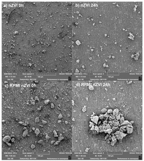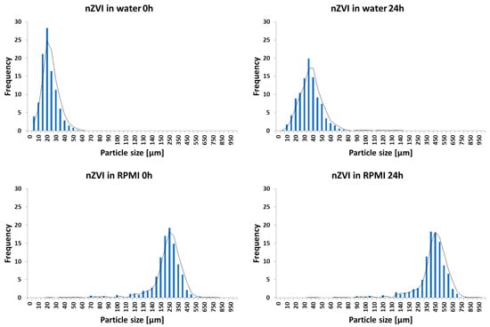 The results of SEM examination revealed an increase in aggregate formation between fresh nZVI NPs and nZVI NPs aged for 24 h in distilled water (Figure 1a,b). However, the aggregation process was much more intense upon RPMI 1640 medium exposure than in distilled water (Figure 1c,d). Analysis of particle size distribution confirmed an increase in aggregate formation over time and revealed a higher aggregation rate in the RPMI 1640 medium than in distilled water (Figure 2). The aggregate size reached values of 19.68 ± 2.77, 33.83 ± 4.11, 228.44 ± 11.30, and 359.06 ± 16.82 μm for fresh nZVI in distilled water, aged nZVI (24 h) in distilled water, fresh nZVI in RPMI 1640 medium, and aged nZVI (24 h) in RPMI 1640 medium, respectively. nZVI particles aggregated and formed larger clusters after exposure, suggesting that after the application of nZVI NPs in remediation practices, rapid aggregation can be expected depending on the complexity of the soil/groundwater [,,]. On the other hand, the composition of the exposure media, especially the protein content, could also affect the behavior of NPs such as aggregation, bioavailability, and respective toxicity []. Many different proteins present in biological tissues/media could form a protein corona around NPs that affects NPs’ behavior and its transport into the cells []. The RPMI 1640 medium has been supplemented with FBS which contains mainly bovine serum albumin and a great variety of other proteins. One of the possible explanations of the nZVI aggregation in RPMI 1640 medium was the presence of albumin (and other proteins) as it was documented in a study with TiO2 NPs conducted by Márquez et al. (2017) [].