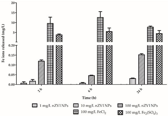 Moreover, ICP-OES analysis of dissolved iron demonstrated that ions were released from the nanomaterial (Figure 3). The dissolved concentrations corresponded to only approximately 0.1–0.2% of the original amount of nZVI NPs depending on the duration of exposure in RPMI 1640 medium. The analysis of the dissolved iron forms revealed that the concentration in case of nZVI reached maximally 0.15 mg/L in comparison with 7.72 to 9.56 and 3.82 to 4.46 mg/L detected from FeCl2 (source of Fe2+ ions) and Fe2(SO4)3 (source of Fe3+ ions). Notably, under specific conditions, nZVI can be oxidized/transformed into ferric and ferrous species that can be involved in ROS generation through Fenton-like processes [,].