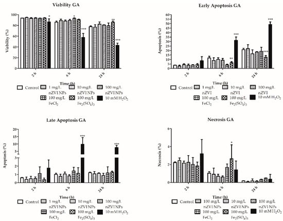 Viability, early and late apoptosis, and necrosis of granular amoebocytes (GA) after exposure to nZVI NPs, FeCl2 and Fe2(SO4)3 for 2, 6 and 24 h; 10 mM H2O2 was used as a positive control; * p < 0.05, ** p < 0.01, *** p < 0.001.
