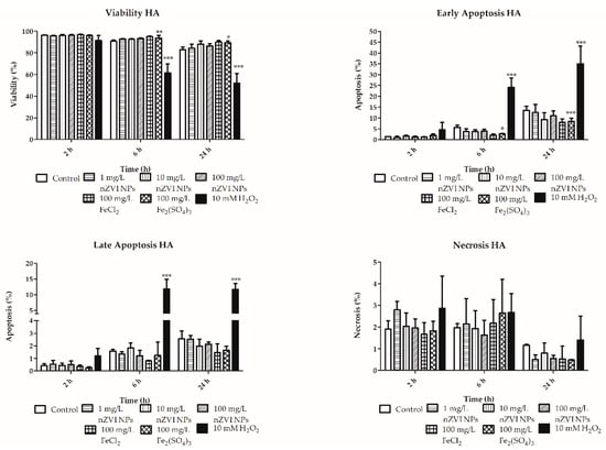Viability, early and late apoptosis, and necrosis of hyaline amoebocytes (HA) after exposure to nZVI NPs, FeCl2 and Fe2(SO4)3 for 2, 6 and 24 h; 10 mM H2O2 was used as a positive control; * p < 0.05, ** p < 0.01, *** p < 0.001.