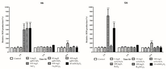 Reactive oxygen species (ROS) generation in granular (GA) and hyaline (HA) amoebocytes after exposure to nZVI NPs, FeCl2 and Fe2(SO4)3; 10 mM H2O2 was used as a positive control; *** p < 0.001.