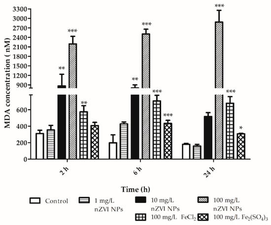 Malondialdehyde (MDA) formation in amoebocytes after exposure to nZVI NPs, FeCl2 and Fe2(SO4)3 for 2, 6 and 24 h; * p < 0.05, ** p < 0.01, *** p < 0.001.