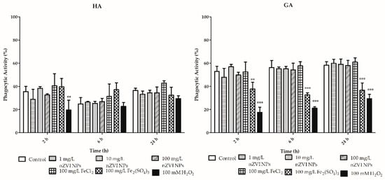 Phagocytic activity of hyaline (HA) and granular (GA) amoebocytes after exposure to nZVI NPs, FeCl2 and Fe2(SO4)3 for 2, 6 and 24 h; 100 mM H2O2 was used as a positive control; ** p < 0.01, *** p < 0.001.