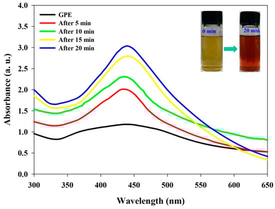 The present work was conducted to biofabricate the AgNPs in a single step employing grape pomace solvent extract (GPE) as a reducing and capping agent. The UV–visible absorption spectroscopy is a simple and sensitive method to examine the formation of NPs. After addition of GPE in silver nitrate solution, development in color (pale yellow to dark brown) of the reaction mixture (Figure 1 inset) indicates the formation of GPE-AgNPs. The progression in color change of the mixture is because of surface plasmon resonance (SPR) and vibration of the synthesized AgNPs. The absorption spectra during GPE-AgNPs synthesis at different time intervals are showed in Figure 1, wherein, the SPR showed a distinct peak at 440 nm. According to Mie’s theory, the number of SPR relies on the shape of NPs and a single peak indicates the spherical GPE-AgNPs formation []. This result was also found similar with silver nanoparticles synthesized using Lawsonia inermis leaf extract [].