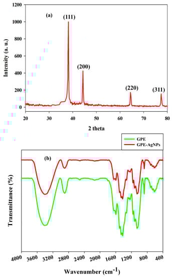 (a) X-ray diffraction pattern of synthesized GPE-AgNPs and (b) FTIR spectrum of GPE and synthesized GPE-AgNPs.
