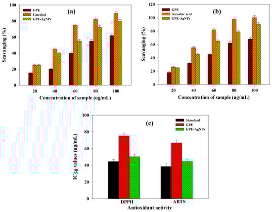 Percentage of (a) 2,2-diphenyl-1-picryhydrazyl (DPPH), (b) 2,2′-Azino-bis(3-ethylbenzothiazoline)-6 sulfonic acid (ABTS) radical scavenging potential by GPE, standard catechol, and biosynthesized GPE-AgNPs at various concentration, and their (c) IC50 values.