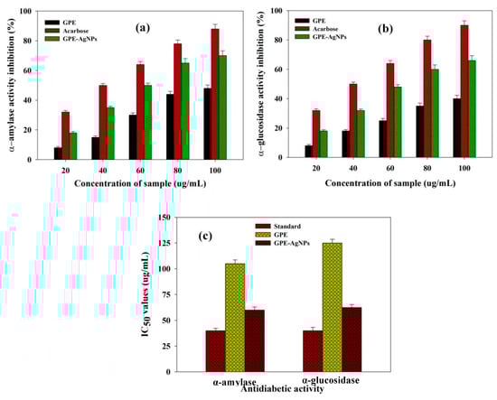 Diabetes is still life-threatening because of limited therapeutic efficacy of available synthetic drugs. The number of diabetic patients is anticipated to be 300 million worldwide by 2025 and thus, narrative approaches are requisite to prevent and to treat diabetes mellitus []. The starch-related enzymes in stomach, mainly, pancreatic α-amylase and intestinal α-glucosidase, have potential in the breakdown of polysaccharides and disaccharides into monosaccharides, and its absorption leads to increase in blood sugar level []. The restraint of these catalysts is particularly important and is effectual strategy for the handling of noninsulin-dependent type-2 diabetes since it hinders the influx of glucose in the blood []. The GPE-AgNPs at various concentrations potentially inhibited α-amylase and α-glucosidase enzymes activities in a dose reliant mode (Figure 5a,b). With increasing concentration of GPE-AgNPs from 20 to 100 µg/mL showed maximum enzymatic inhibition in both enzyme activities of about 70% and 65%, respectively, whereas GPE showed moderate inhibition (48% and 40%) in both enzyme activities. The IC50 values of GPE, standard acarbose, and synthesized GPE-AgNPs for α-amylase and α-glucosidase are shown in Figure 5c.