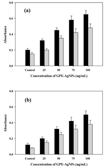 Release of absorbing materials from the cell suspensions at 260 nm (black bar) and 280 nm (gray bar) of (a) E. coli and (b) S. aureus bacteria treated with different concentration of GPE-AgNPs after 6 h of incubation.