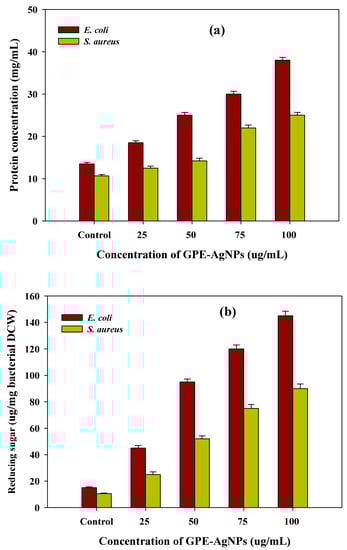 Cellular leakage analysis of (a) protein content and (b) reducing sugar from the cell suspensions of E. coli and S. aureus bacteria treated with different concentration of GPE-AgNPs after 6 h of incubation.