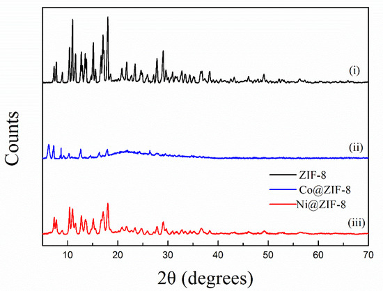 The X-ray diffraction patterns of petal-like ZIF-8 crystal and its doped derivatives are shown in the Figure 1. This XRD pattern of ZIF-8 was similar to that of the reported petal-like ZIF-8. [] However, significant differences in 2θ shifts and peak value were observed from the doped materials. This might be attributed to the fact that the replacement of Zn2+ by Co2+ or Ni2+ changed the crystal structure of ZIF-8. The SEM pictures confirmed the speculation. As is shown in Figure 2, the dried ZIF-8 materials had a petal shape with smooth surface, while Co@ZIF-8 was close to a spherical particle with rougher surface and smaller size. It may be deduced that the existence of Co2+ can promote the formation of the shape of the ZIF-8 crystal. Saliba et al. [] investigated the effects of cobalt ions addition on the structure of rhombic dodecahedral shaped-ZIF-8. They also found that the mixed Co@ZIF-8 crystals were smaller than ZIF-8. As also can be seen in Figure 2C,F, Ni2+ addition dramatically changed the petal-like ZIF-8 and made it have a layered topology. This was also exactly the converse phenomenon found by Yang et al. [] when Ni-MOF was doped with Zn2+. The reason of the different behaviors of doped Co2+ and Ni2+ may lies in the fact that electronegativity of Co2+ is weaker than Ni2+, thus having more stable structures in the ZIF-8 frameworks.