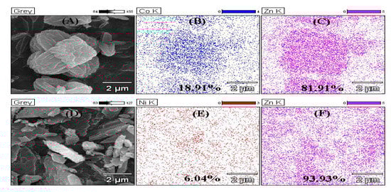 Energy-dispersive X-ray spectroscopy (EDS) mapping of ZIF-8 and its derivatives. (A) SEM of Co@ZIF-8; (B) Distribution of Co in Co@ZIF-8; (C) Distribution of Zn in Co@ZIF-8; (D) SEM of Ni@ZIF-8; (E) Distribution of Ni in Ni@ZIF-8; (F) Distribution of Zn in Ni@ZIF-8.