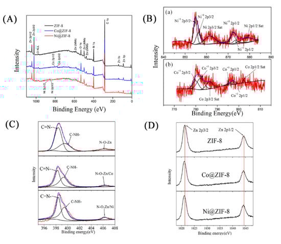 (A) X-ray photoelectron spectroscopy (XPS) wide scan spectra of ZIF-8 materials and doped materials. (B(a)) Ni 2p, (B(b)) Co 2p, (C) N 1s, (D) Zn 2p.