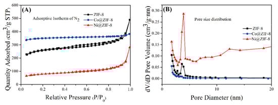 The adsorption and desorption curves of ZIF-8 and its derivatives are shown in Figure 5A, and the shape of the curves show typical mesoporous adsorption. There is also a hysteresis loop in the curve, which shows that the pore size distribution of the material is relatively uniform. The pore size distributions of the three materials were shown in Figure 5B, and the calculation results were obtained by the Barrett–Joyner–Halenda (BJH) calculation method. The three materials all show obvious large pore diameters, with pore diameters >2 nm as the distribution of mesopores. Compared with the 3.4 Å of the general cube-shaped ZIF-8 [], the material synthesized here has a greater advantage in pore size. The average pore diameter and surface area of the three materials were shown in Table 2. Petal-like ZIF-8 have an average pore diameter of about 8 nm. Doping with Co ions significantly increased the specific surface area of ZIF-8, but on the contrary, the average pore diameter decreased to 5 nm. Unlike the Co@ZIF-8, doping with Ni ions significantly reduced the specific surface area of ZIF-8, but the pore size was clearly increased. Expanded specific surface area and reduced pore size can influence the adsorption efficiency to heavy metals, which will be conducted in the following series of experiments.