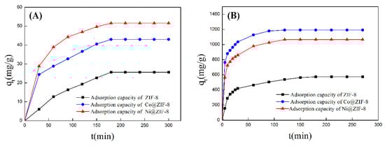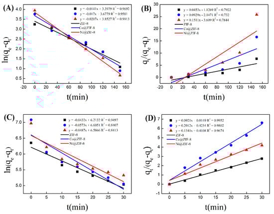 In order to further analyze the adsorption process of the three materials, pseudo-first-order and pseudo-second-order equations were used to model the adsorption process. As is shown in Figure 8, the data of ZIF-8 adsorption of chromium were basically distributed on a straight line in the pseudo first-order model (Figure 8A), which is simulated by Equation (1). In contrast, when using Equation (2) for the simulation, the data of ZIF-8 adsorption of chromium was not well distributed in the pseudo-second equation on a straight line, and the correlation coefficient was less than 0.8 (Figure 8B). The data of material adsorption of copper was in accordance with the pseudo-second equation (Figure 8C,D). When it came to the kinetic simulations of the adsorption results of Co@ ZIF-8 and Ni@ZIF-8, they were similar to the analysis results of ZIF-8. That meant the adsorption results of anionic chromium in ZIF-8 and doped materials were more in line with the pseudo-kinetics. The first-order model, and the adsorption of oppositely charged copper ions fitted the second-order kinetic model. The reason for the above difference is that the adsorption of chromium ions is mainly through physical adsorption, while the adsorption of copper ions is mainly by chemical adsorption.