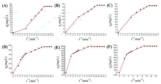 The adsorption of porous materials can generally be divided into three stages []. The first stage is the diffusion of the adsorbed substance to the surface of the adsorbent, so this stage is also called the boundary layer diffusion. The second stage is a process of reducing the concentration of the adsorbed substance. The third stage is to reach an adsorption equilibrium stage, which includes the internal pore diffusion of porous materials. Therefore, here we used the Weber–Morris intra-particle diffusion equation [] to study the adsorption process of the pores in the adsorption process.