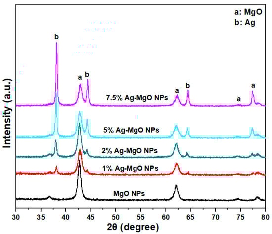 X-ray diffraction was carried out to investigate the phase purity, crystal structure, and particle size of prepared samples. Figure 1 shows the XRD spectra of pure MgO NPs and Ag (1%, 2%, 5%, 7.5 mol%)-doped MgO NPs. The position of the first peak of pure MgO and Ag (1%, 2%, 5%,7.5 mol%)-doped MgO NPs is at 2θ values 42.69°, 42.75°, 42.78°, 42.81°, and 42.91°, respectively. This slight shifting of peaks to a higher angle could be due to integration of Ag in MgO NPs crystals. This phenomenon was also reported by other investigators [,,]. Presence of Ag peaks in Ag-doped MgO NPs is due to the fact that the ionic radii of Ag+ (0.126 nm) is larger than the ionic radii of Mg (0.066 nm) [,]. Further, the crystallite size (D) of prepared samples was calculated by Scherrer’s equation, which is given by Equation (2) [].