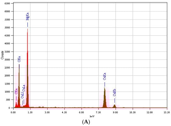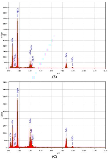 EDX spectra of pure (A), 5% Ag-MgO NPs (B), and 7.5% Ag-MgO NPs (C).