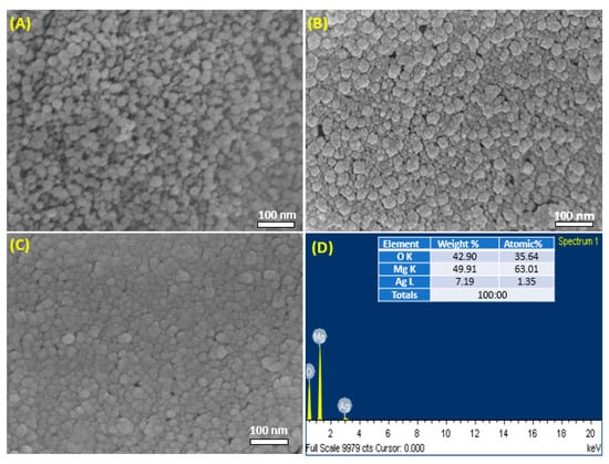 Surface morphology and elemental composition of prepared samples were further analyzed by scanning electron microscopy (SEM). Figure 4A–C represents the typical SEM images of pure MgO NPs, Ag (1%) MgO NPs, and Ag (7.5%) MgO NPs, respectively. These images indicated spherical morphology with uniform distribution []. Figure 4D shows the atomic percentage of Mg, Ag, and O elements of 7.5% Ag-MgO NPs. SEM images suggest a slight difference in the morphology of pure MgO and Ag-MgO NPs []. In addition, aggregation polarity and electrostatic attraction of prepared samples leads to agglomeration of NPs [].