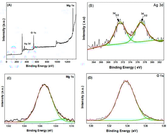 The chemical composition and elemental status of 7.5% Ag-doped MgO NPs were detected by XPS. Figure 6A shows the signals of magnesium (Mg), silver (Ag), and oxygen (O), which indicate the presence of these elements in the prepared samples. The Ag 3d XPS spectra of 7.5% Ag-doped MgO NPs is illustrated in Figure 6B. The characteristic spin-orbits Ag 3d5/2 and Ag 3d3/2 are observed at 371.39 eV and 377.09 eV, respectively. This finding proves the existence of Ag and Ag-Mg-O compounds in the synthesized samples [,]. Mg 1s XPS spectra (Figure 6C) showed the main and shoulder peaks at 1306.52 eV and 1308.93 eV, respectively, which suggests that Mg ions are present in a +2 oxidation state []. Furthermore, Figure 6D illustrates the O1s spectra with two sub-peaks at 533.81 eV and 536.18 eV, respectively. There is a possibility that adsorbed oxygen caused the first peak of O1s, while the second peak of O1s could be attributed to the lattice oxygen of MgO [,].